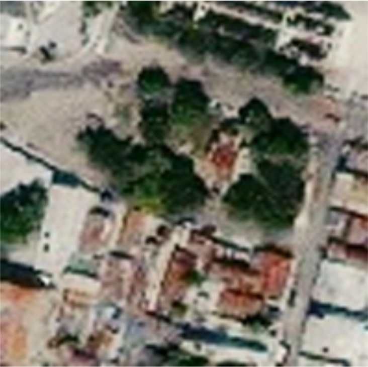 Neural network based upsampling - Although the literature for image super-resolution (improving the resolution of the images) is considered to be extensive, much of this literature is focused upon the aesthetic visual enhancement of images versus the accurate forensic validity of such enhancement. Also, the state of the art models from this literature do not emphasize satellite imagery, since these models tend to be predominantly (if not almost exclusively) trained on images from ground-based photodetection platforms. Nevertheless, an attempt was made to upsample these images using a state of the art, RDNet model. An example is shown below.