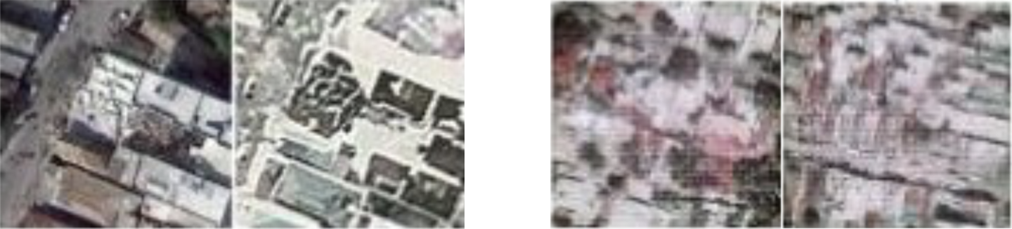 The collected images were pre-processed to change brightness and contrast as the pre and post-catastrophe images are taken during different lighting conditions. These images were used to train deep learning models to generate more data. We trained a Pix2Pix network that uses paired images to convert from one domain to another. We also trained a CycleGAN network that performs unpaired image translation from one domain to another. We also modified the existing architecture of the generator module in CycleGAN. We replaced the classic UNet which is used as generator and replaced the backbone network from VGGNet to EfficientNet b3 and EfficientNet b4. The generated samples are shown below.