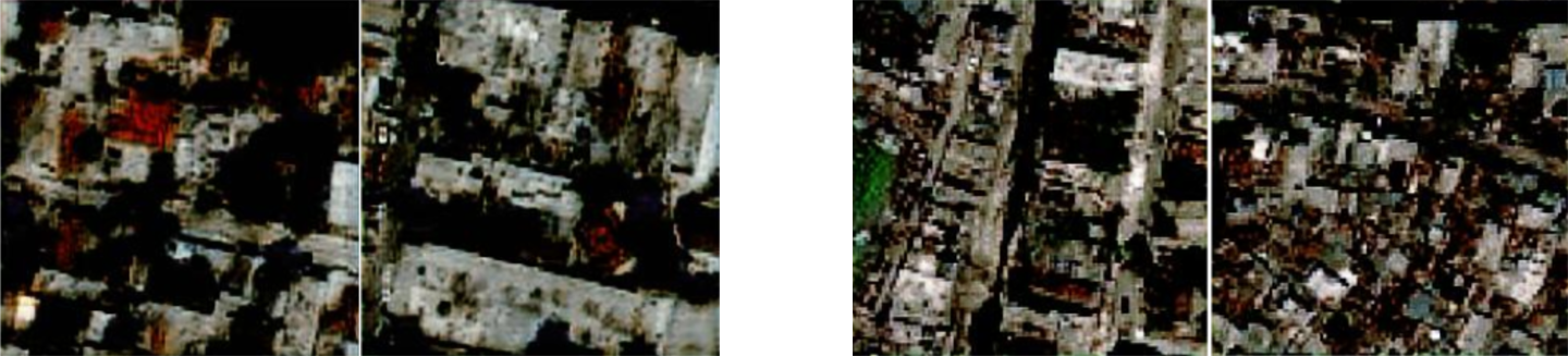 The CycleGAN model with different backbone networks was able to generate visually appealing samples. However, evaluating the generated images through visual inspection alone is an ineffective and overly subjective way to decide if these images are valid (meaning whether they emulate actual structural changes). In order to evaluate the generative model objectively, we used the inception score metric. Even though the images generated by EfficientNet b3 and b4 as backbone appear to be relatively better, they achieve a low inception score and it is also readily apparent that several pixels in the image are blacked out. Therefore, the problem as mentioned in the change detection part might lie in the discrepancy of the spatial resolution between the spatial resolution of pre (lower spatial resolution satellite) and post (higher spatial resolution aerial) damage-site images.
